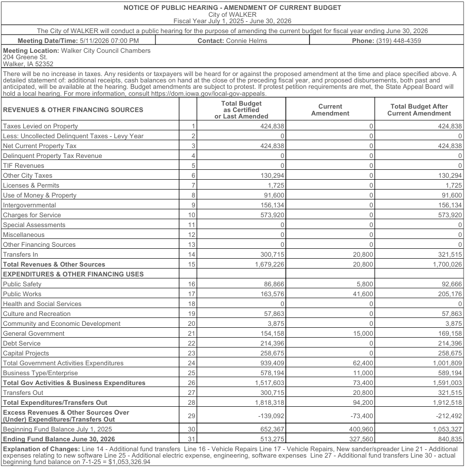 Notice of Public Hearing for Fiscal Year 2026 Budget Amendment #2 Apr 27 Written By Thomas Helmer Notice of Public Hearing Fiscal Year 2026 Budget Amendment #2 on 5/11/26 @ 7 p.m. Download Thomas Helmer